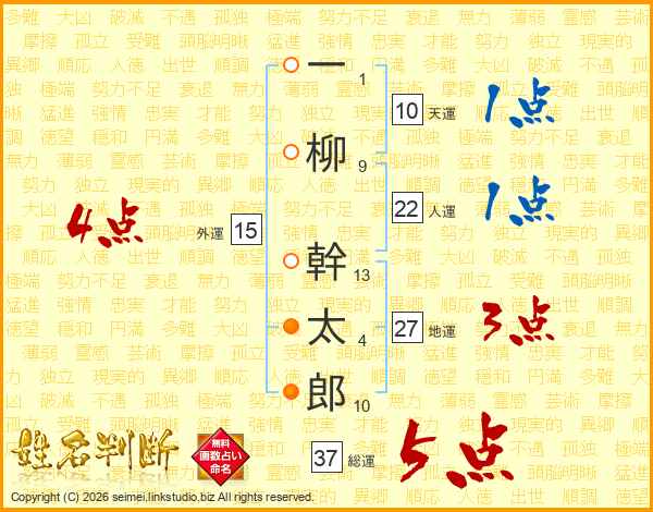 一柳幹太郎さんの総運は37画の5点!