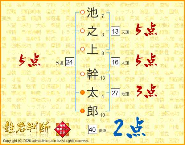 池(7画)之(3画)上(3画) 幹(13画)太(4画)郎(10画)