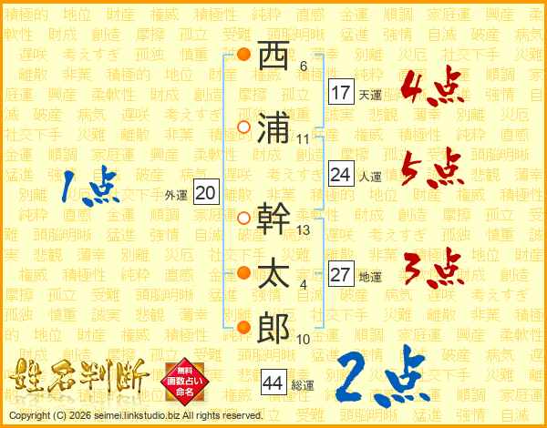 西浦幹太郎さんの総運は44画の2点!