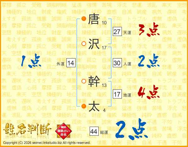 唐(10画)沢(17画) 幹(13画)太(4画)