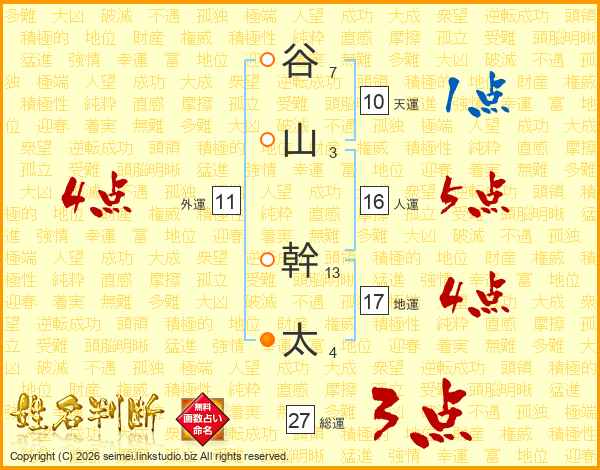 生活面を象徴する運勢です。外部から受ける影響力を表し、結婚運、家庭運や職場、環境への順応性を表します。総運から人運を引いた画数。姓や名が1文字の場合を除く。