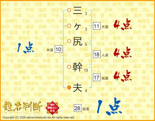 三(3画)ヶ(3画)尻(5画) 幹(13画)夫(4画)