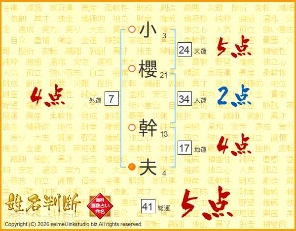 小(3画)櫻(21画) 幹(13画)夫(4画)