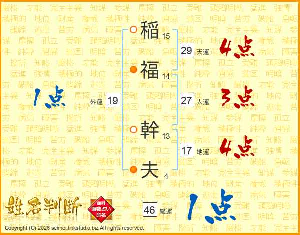 稲(15画)福(14画) 幹(13画)夫(4画)