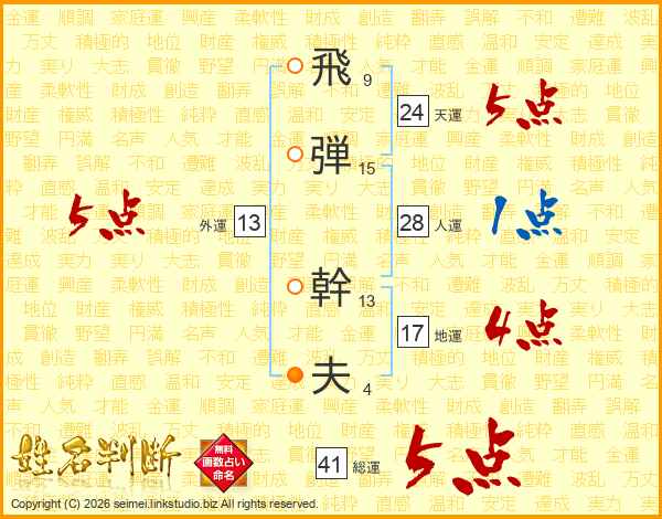 飛(9画)弾(15画) 幹(13画)夫(4画)