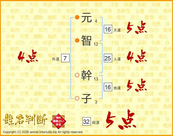 家系が持つ宿命的な運勢を表します。祖先から受け継いだ苗字ですので自分の力が及びません。家柄を象徴します。苗字の合計画数。