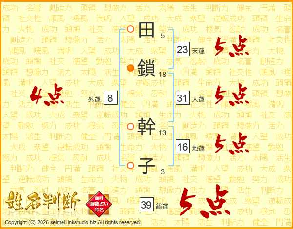 田(5画)鎖(18画) 幹(13画)子(3画)