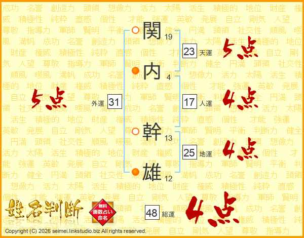 関(19画)内(4画) 幹(13画)雄(12画)