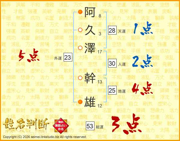 阿(8画)久(3画)澤(17画) 幹(13画)雄(12画)