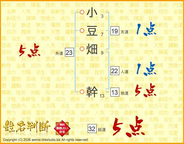 小(3画)豆(7画)畑(9画) 幹(13画)