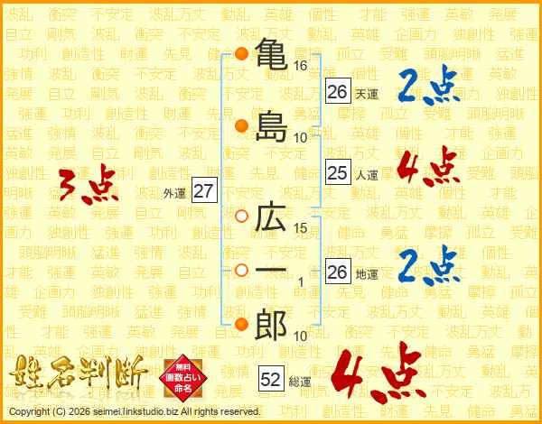 亀(16画)島(10画) 広(15画)一(1画)郎(10画)