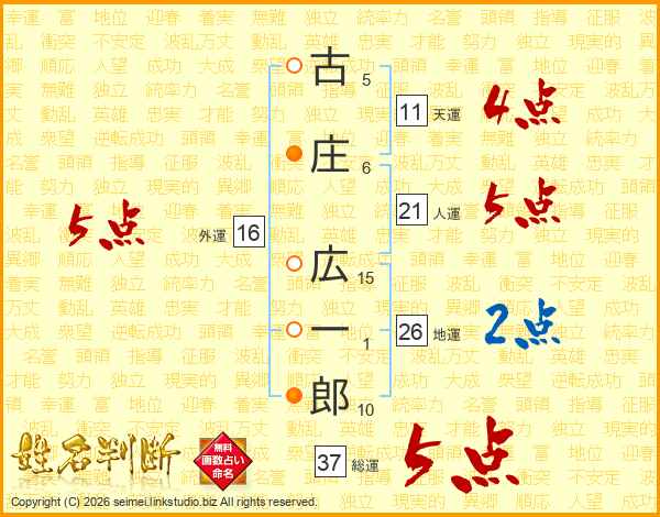 古(5画)庄(6画) 広(15画)一(1画)郎(10画)