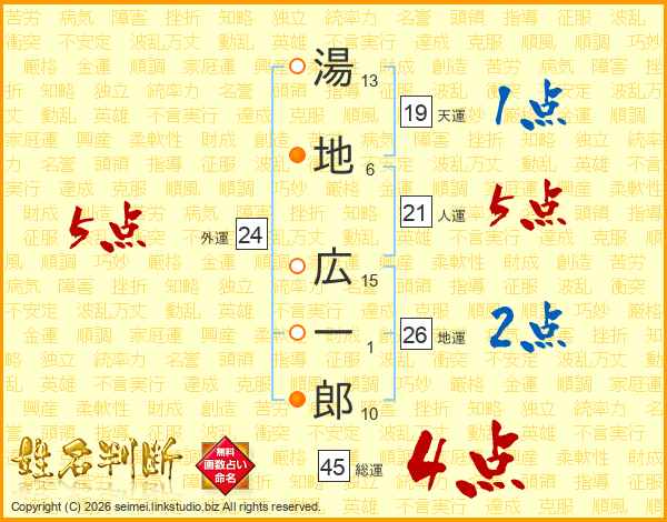 湯(13画)地(6画) 広(15画)一(1画)郎(10画)
