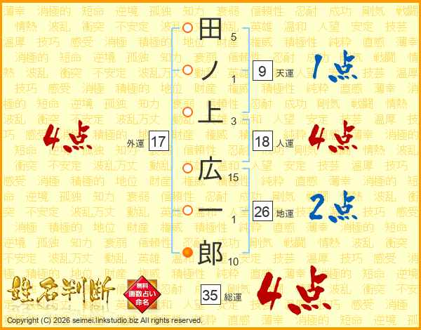 生活面を象徴する運勢です。外部から受ける影響力を表し、結婚運、家庭運や職場、環境への順応性を表します。総運から人運を引いた画数。姓や名が1文字の場合を除く。