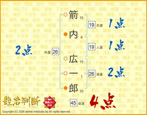 箭(15画)内(4画) 広(15画)一(1画)郎(10画)