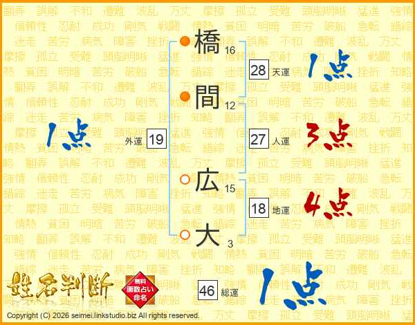 あなたの人生を表す1番重要な運勢です。生涯を通じて影響する総合運となり、主に50歳以降の晩年期に影響を及ぼします。苗字と名前の合計画数。