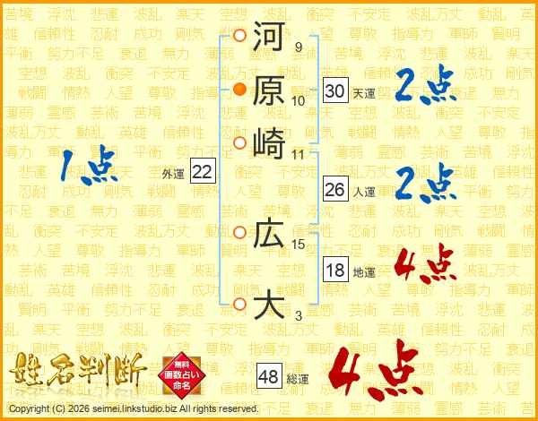 河(9画)原(10画)崎(11画) 広(15画)大(3画)