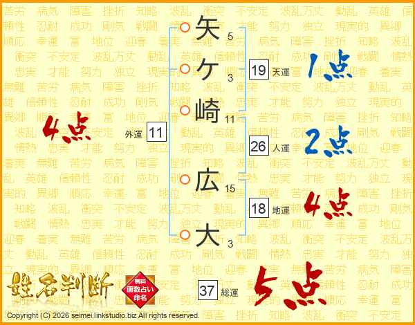 矢(5画)ケ(3画)崎(11画) 広(15画)大(3画)