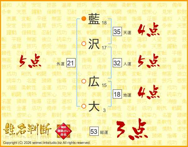 生活面を象徴する運勢です。外部から受ける影響力を表し、結婚運、家庭運や職場、環境への順応性を表します。総運から人運を引いた画数。姓や名が1文字の場合を除く。