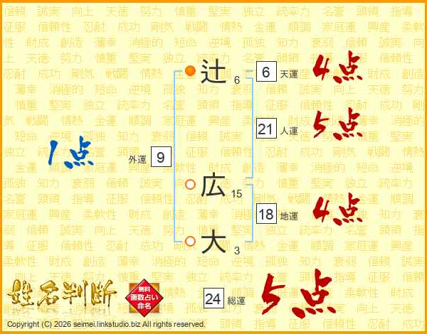 生活面を象徴する運勢です。外部から受ける影響力を表し、結婚運、家庭運や職場、環境への順応性を表します。総運から人運を引いた画数。姓や名が1文字の場合を除く。