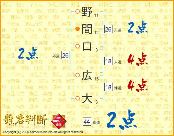 あなたの人生を表す1番重要な運勢です。生涯を通じて影響する総合運となり、主に50歳以降の晩年期に影響を及ぼします。苗字と名前の合計画数。