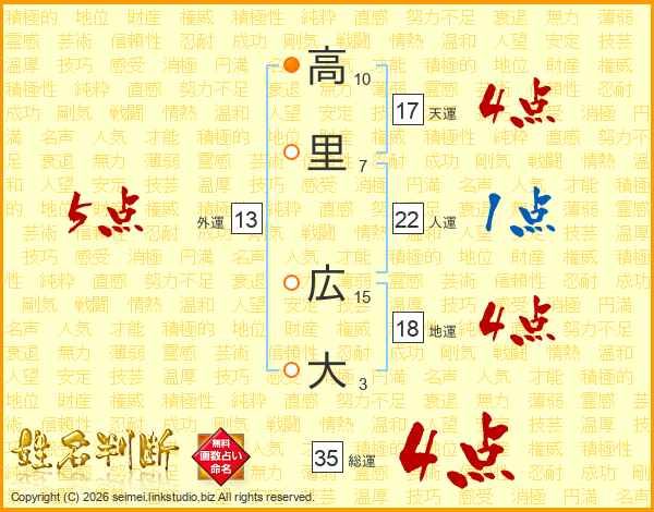 高里広大さんの総運は35画の4点!