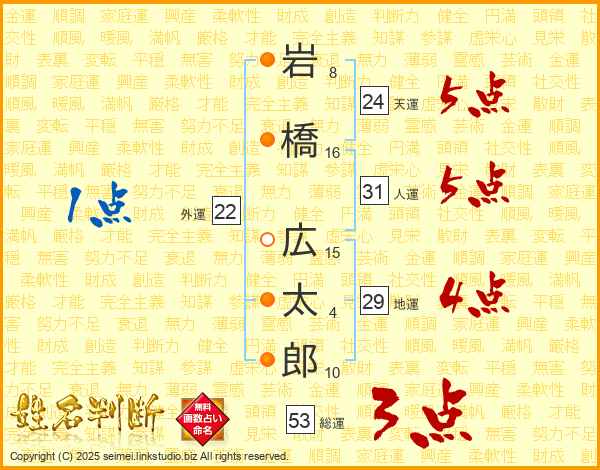 岩(8画)橋(16画) 広(15画)太(4画)郎(10画)