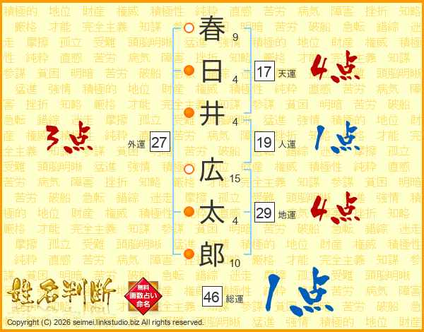 春(9画)日(4画)井(4画) 広(15画)太(4画)郎(10画)