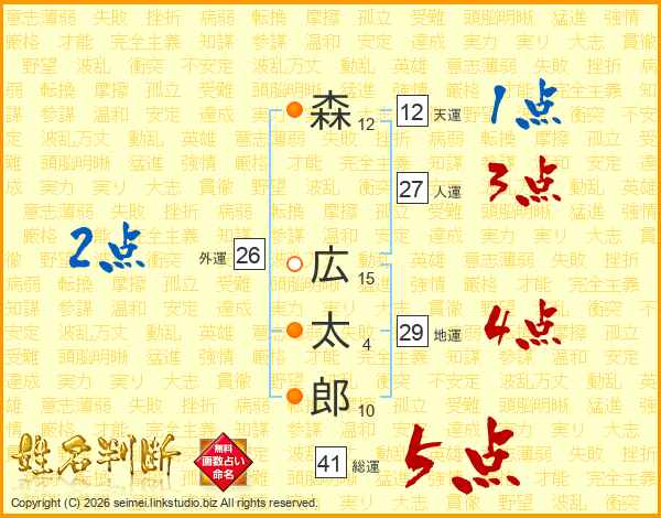 生活面を象徴する運勢です。外部から受ける影響力を表し、結婚運、家庭運や職場、環境への順応性を表します。総運から人運を引いた画数。姓や名が1文字の場合を除く。