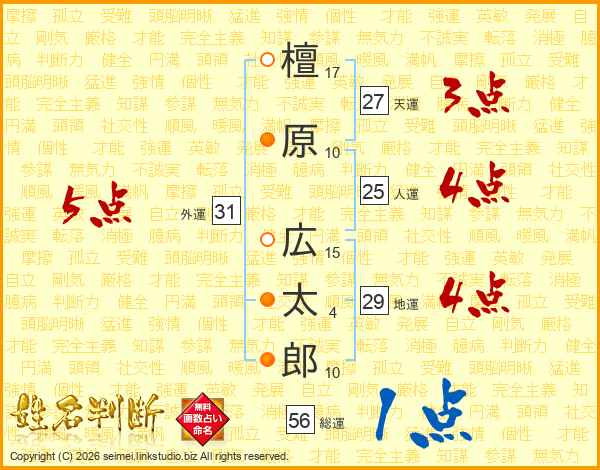 檀(17画)原(10画) 広(15画)太(4画)郎(10画)