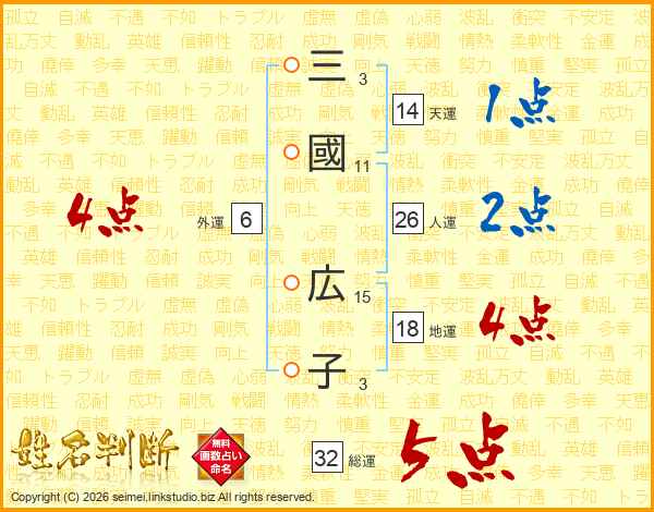 生活面を象徴する運勢です。外部から受ける影響力を表し、結婚運、家庭運や職場、環境への順応性を表します。総運から人運を引いた画数。姓や名が1文字の場合を除く。