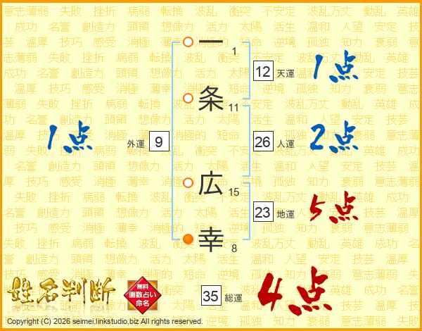 あなたの人生を表す1番重要な運勢です。生涯を通じて影響する総合運となり、主に50歳以降の晩年期に影響を及ぼします。苗字と名前の合計画数。