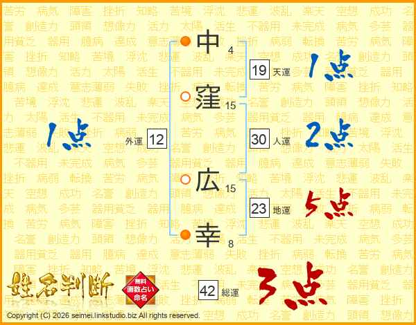 中(4画)窪(15画) 広(15画)幸(8画)