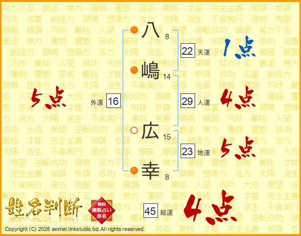 八(8画)嶋(14画) 広(15画)幸(8画)
