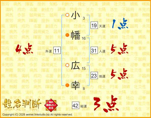 生活面を象徴する運勢です。外部から受ける影響力を表し、結婚運、家庭運や職場、環境への順応性を表します。総運から人運を引いた画数。姓や名が1文字の場合を除く。