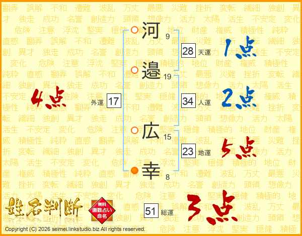 河(9画)邉(19画) 広(15画)幸(8画)