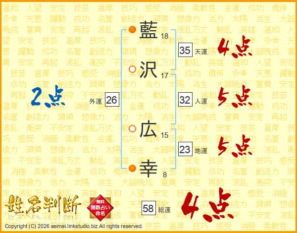 藍(18画)沢(17画) 広(15画)幸(8画)