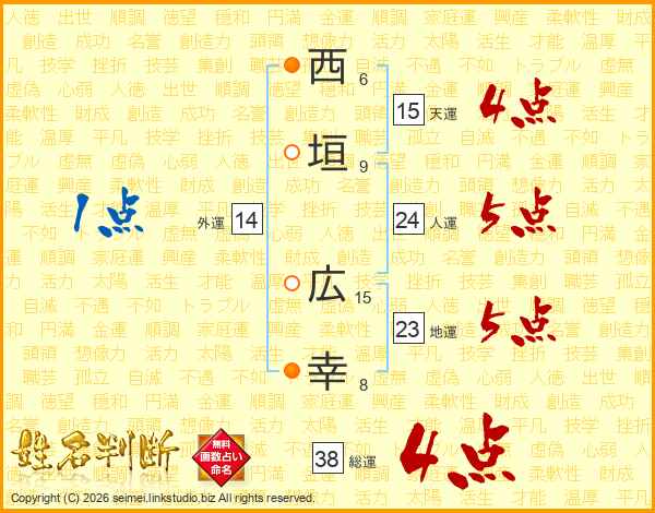 西(6画)垣(9画) 広(15画)幸(8画)