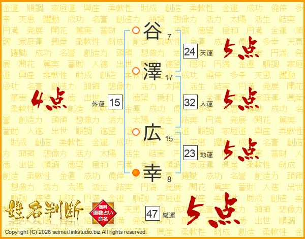 谷(7画)澤(17画) 広(15画)幸(8画)