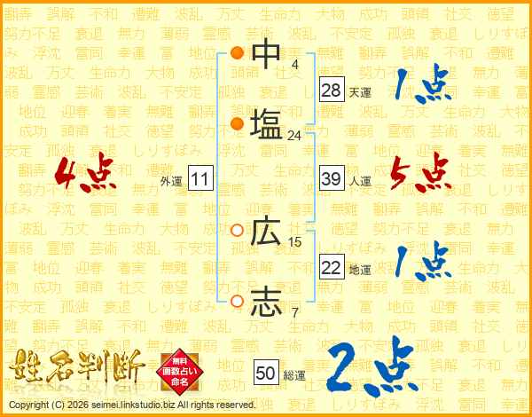 中(4画)塩(24画) 広(15画)志(7画)