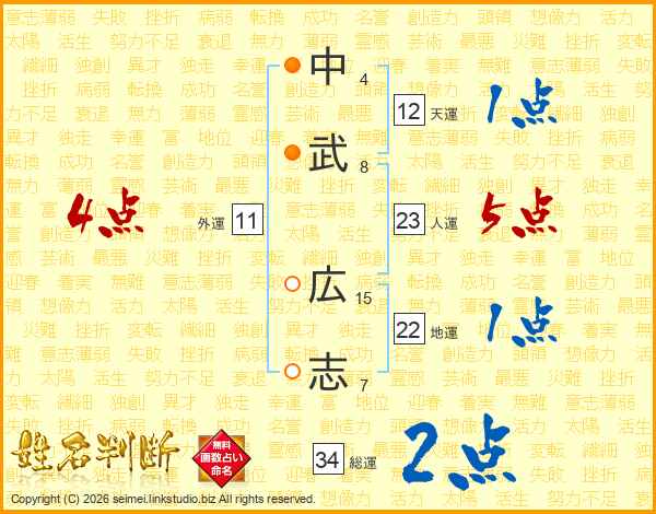 中(4画)武(8画) 広(15画)志(7画)