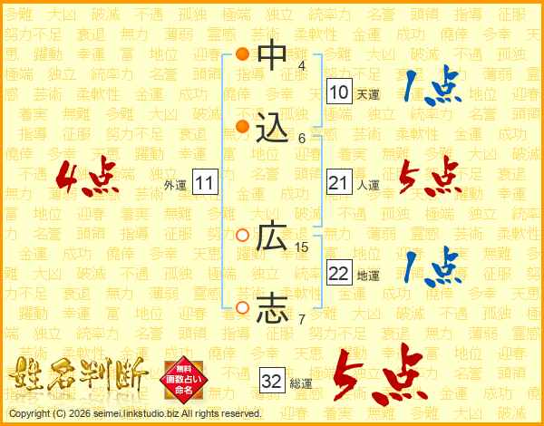 生活面を象徴する運勢です。外部から受ける影響力を表し、結婚運、家庭運や職場、環境への順応性を表します。総運から人運を引いた画数。姓や名が1文字の場合を除く。
