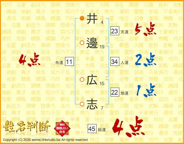 あなたの人生を表す1番重要な運勢です。生涯を通じて影響する総合運となり、主に50歳以降の晩年期に影響を及ぼします。苗字と名前の合計画数。
