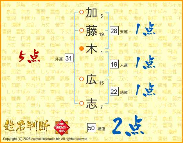加(5画)藤(19画)木(4画) 広(15画)志(7画)