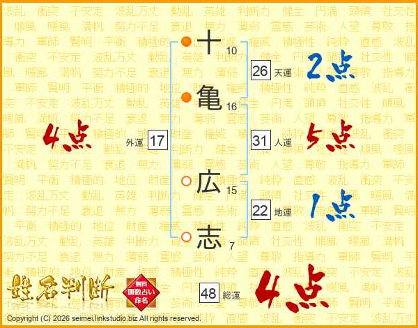 生活面を象徴する運勢です。外部から受ける影響力を表し、結婚運、家庭運や職場、環境への順応性を表します。総運から人運を引いた画数。姓や名が1文字の場合を除く。