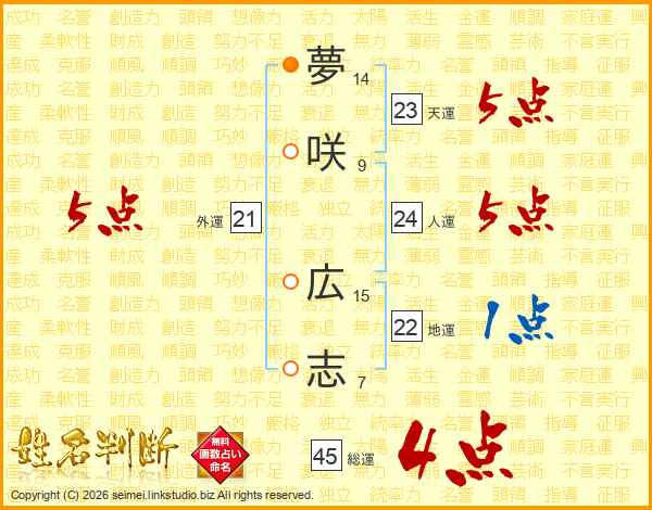 あなたの人生を表す1番重要な運勢です。生涯を通じて影響する総合運となり、主に50歳以降の晩年期に影響を及ぼします。苗字と名前の合計画数。