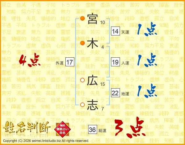 宮(10画)木(4画) 広(15画)志(7画)
