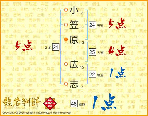 小(3画)笠(11画)原(10画) 広(15画)志(7画)