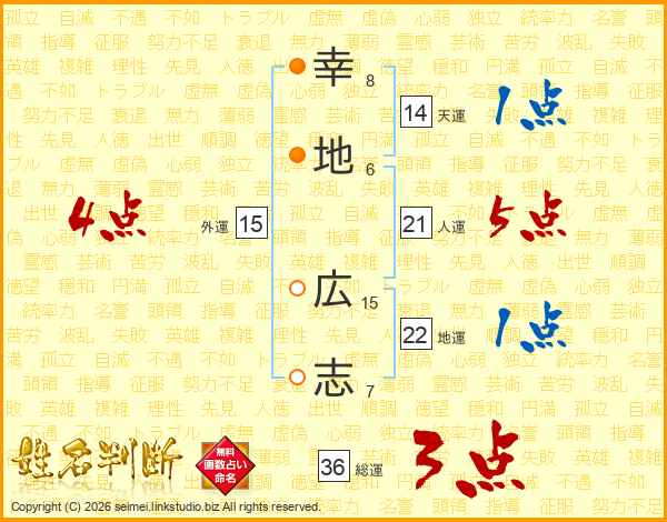 生活面を象徴する運勢です。外部から受ける影響力を表し、結婚運、家庭運や職場、環境への順応性を表します。総運から人運を引いた画数。姓や名が1文字の場合を除く。