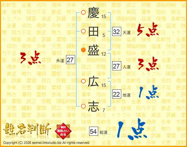 慶(15画)田(5画)盛(12画) 広(15画)志(7画)